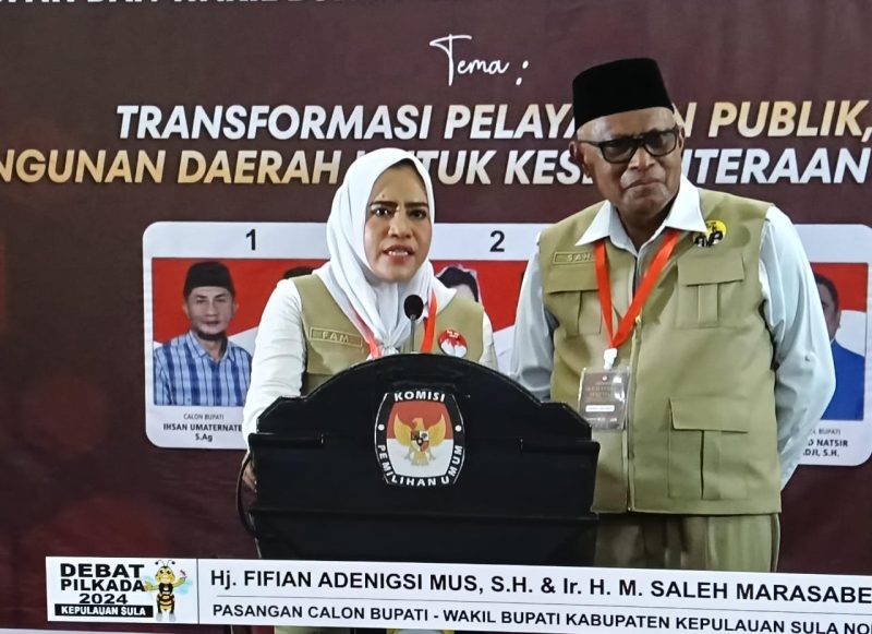 Saat menyampaikan visi misi Paslon Bupati dan Wakil Bupati Sula nomor urut 2, Hj.Fifian Adeningsi Mus dan H. Saleh Marasabesy tampil percaya diri karena menguasai panggung debat.