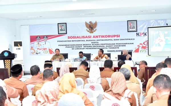 Okebaik- Komisi Pemberantasan Korupsi (KPK) melalui Bidang Pendidikan dan Peran Serta Masyarakat bersama Pemerintah Kota Ternate menggelar sosialisasi anti korupsi di aula lantai I Kantor Wali Kota, Selasa (30/9/2025).